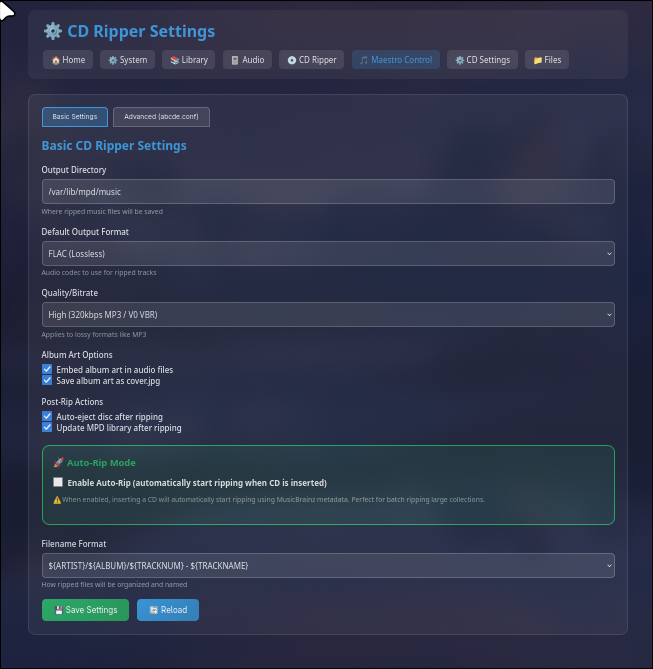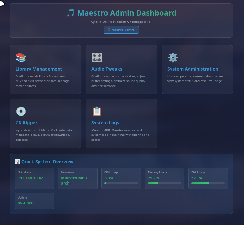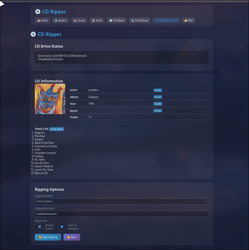 Transform your music collection into a powerful streaming server with beautiful web UI, automatic CD ripping, Last.fm integration, and comprehensive system management.